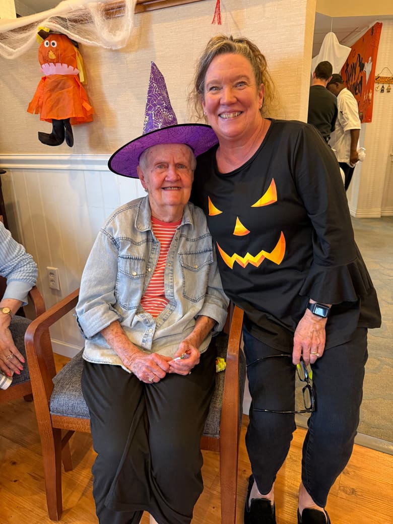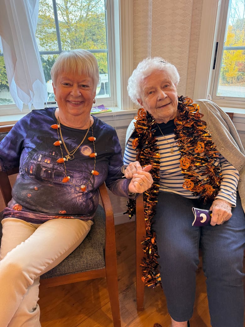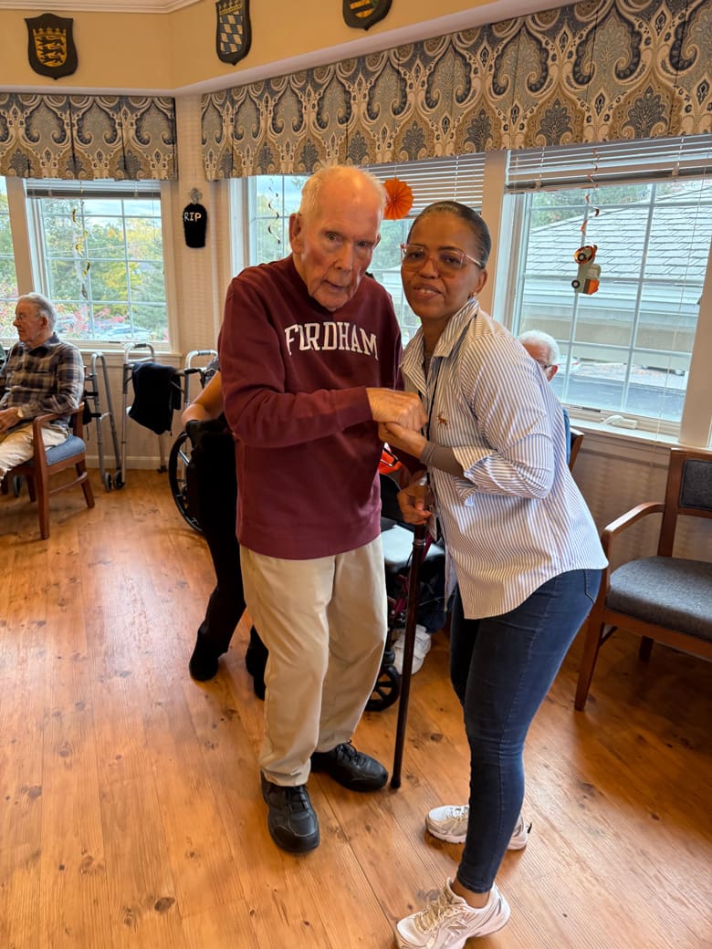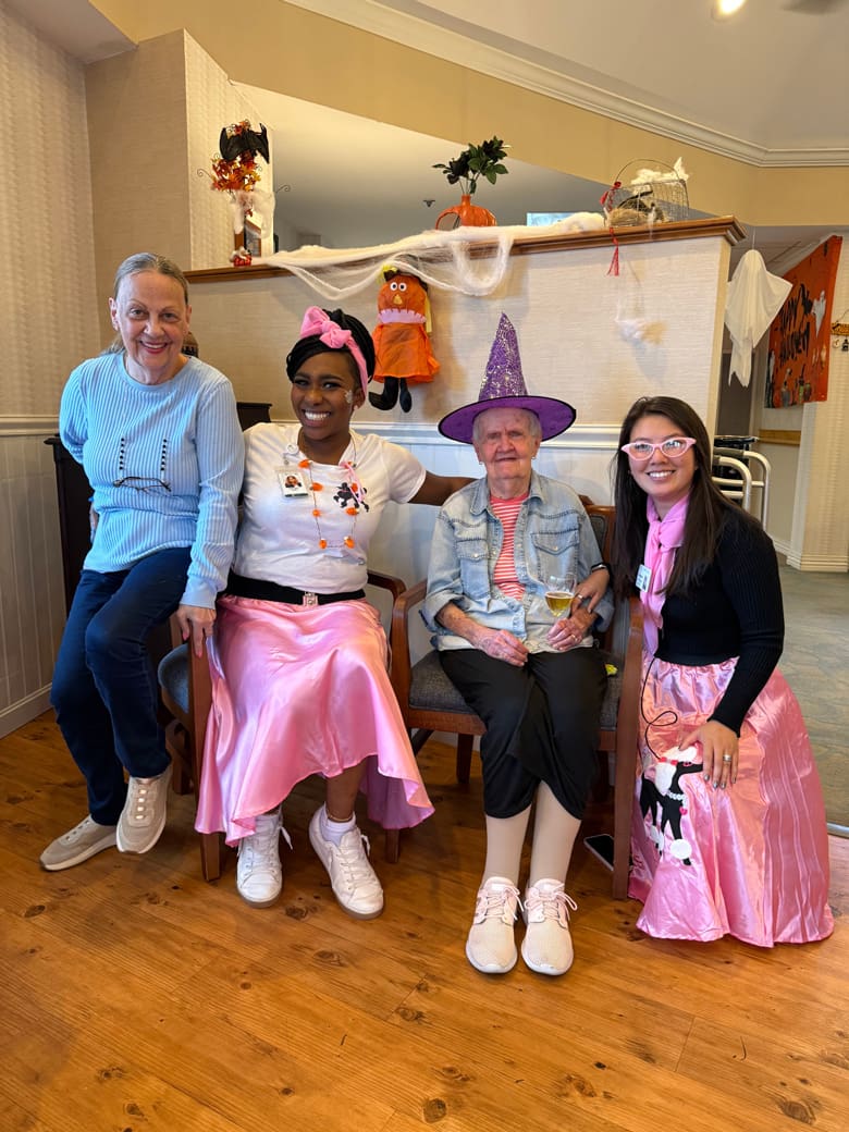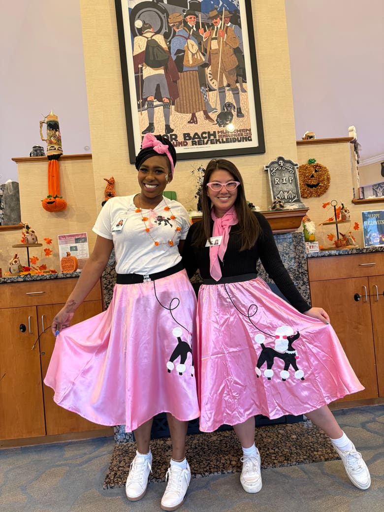 [Activities Director Daffney Guey showed resident Agnes Barrett her 1950’s poodle skirt outfit at the Edelweiss Assisted Living facility at German Centre in West Roxbury. Photo by John Tlumacki/Globe Staff]