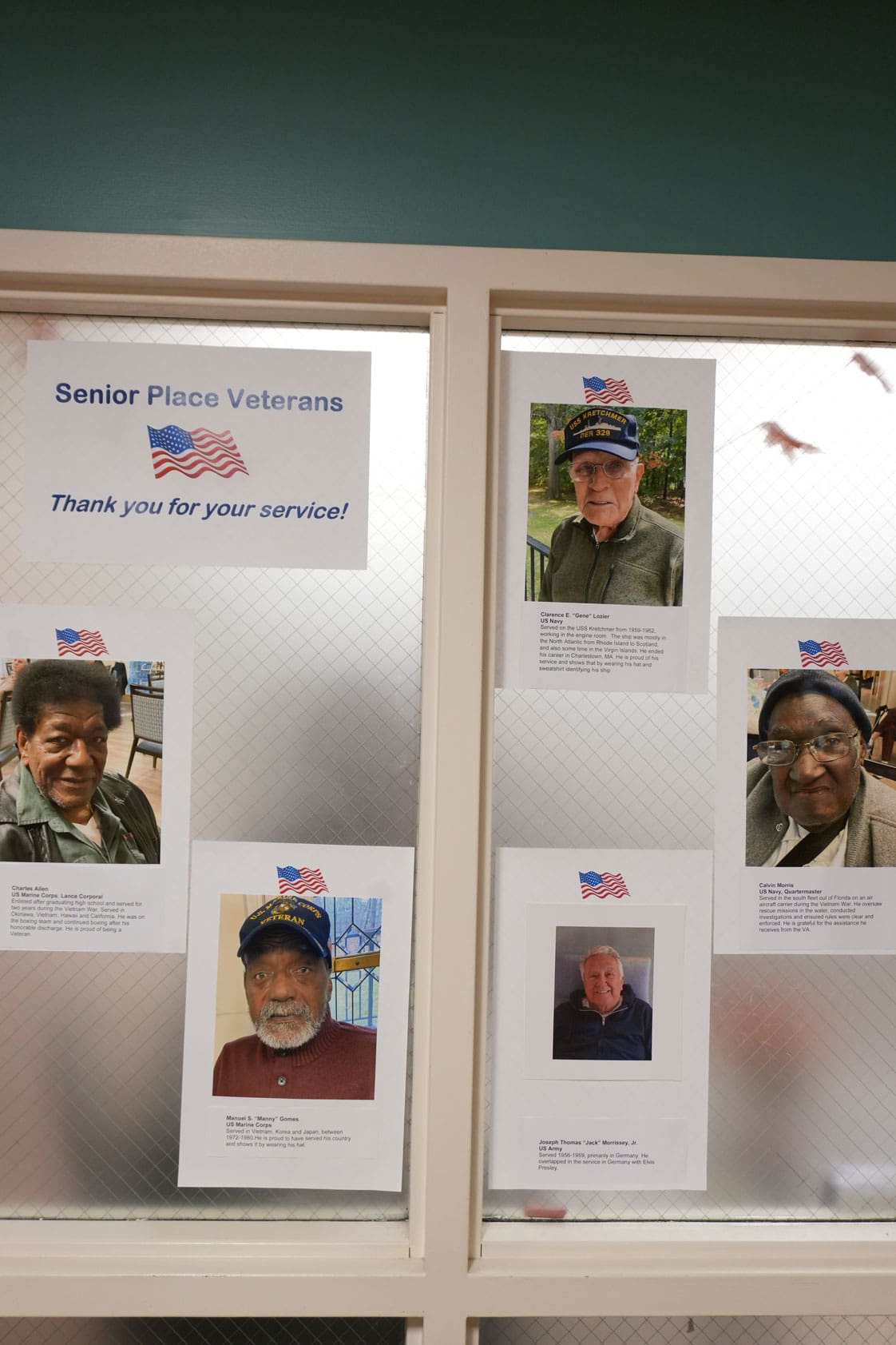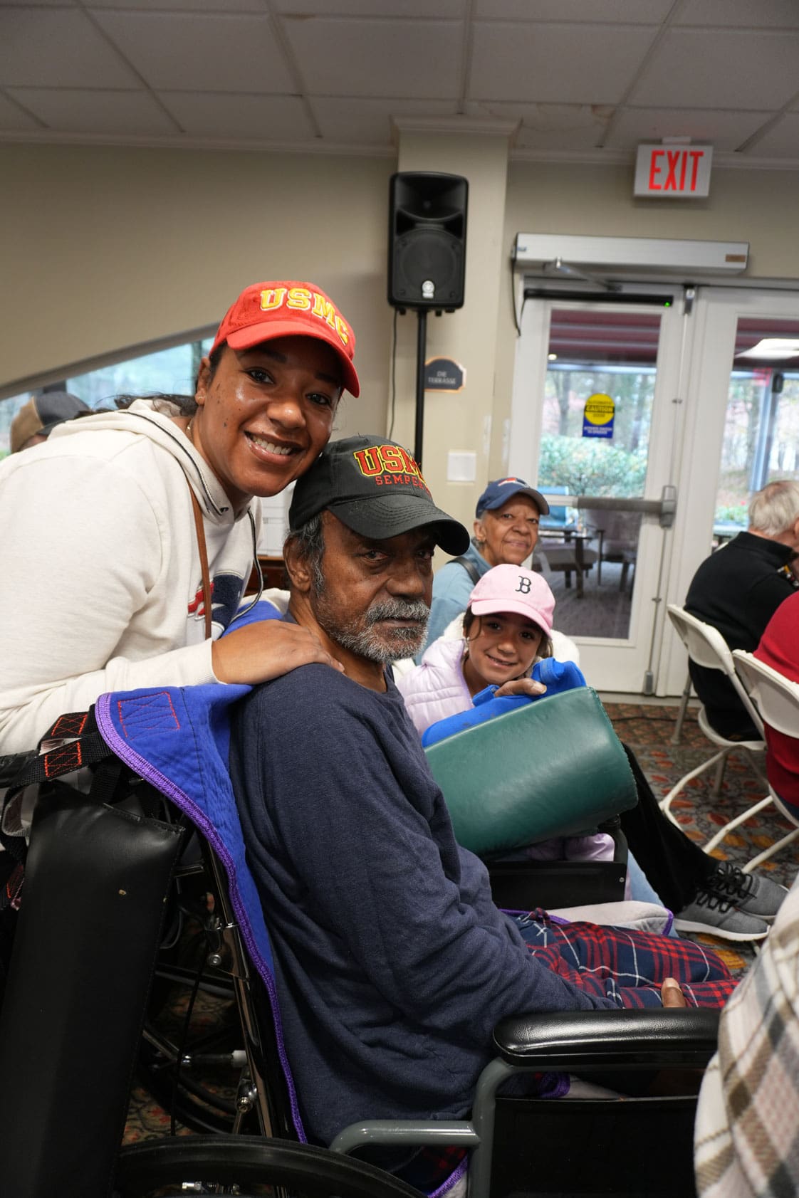 • A couple happily posing for the camera in their wheelchairs, with CNAs happily standing behind them.